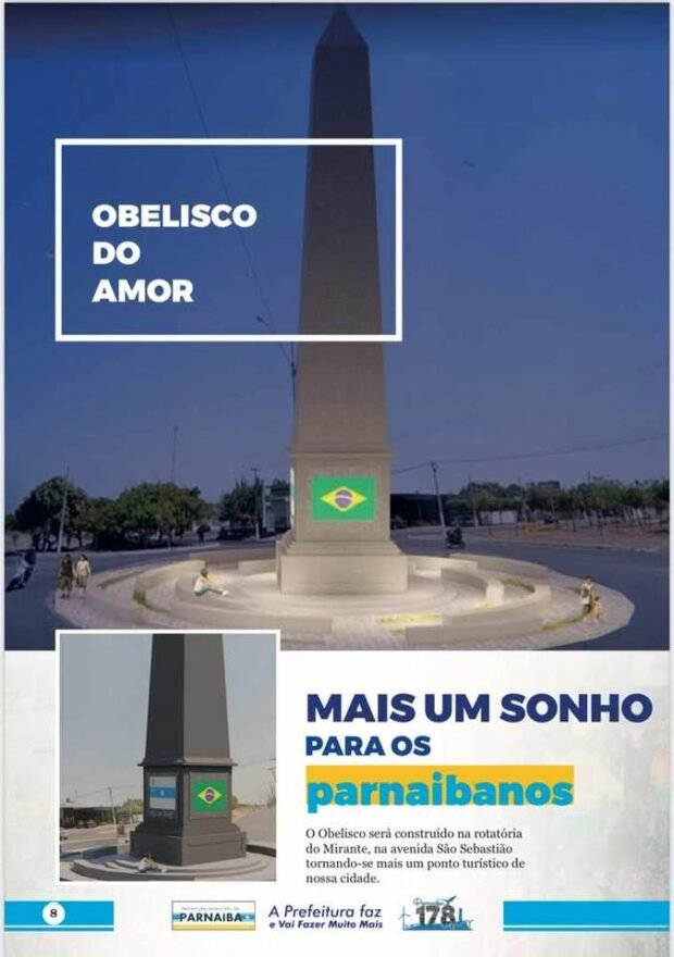 Foi ano ano passado, por ocasião do aniversário de Parnaíba, que a então secretária de infraestrutura, Gracinha M. Sousa anunciou para licitar no final daquele ano a construção de um tal “obelisco do amor” – que é “um simbolo da gestão prefeito Mão Santa, que é a questão do amor ao próximo, amor à cidade(…)”; prometeu também urbanizar os canteiros da Avenida São Sebastião/ Francisca Borges, para espaços gastronômicos, enfim, “Parnaíba terá outro booom para atrair mais turistas”, disse a ex-secretária. E nada aconteceu.