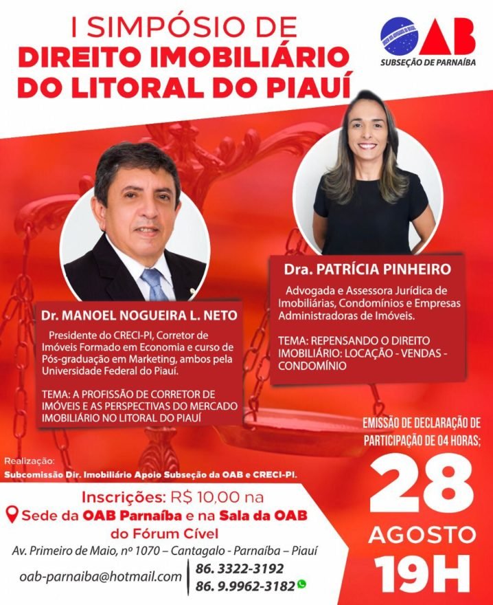 O I Simpósio de Direito Imobiliário do Litoral do Piauí, que acontece dia 28 próximo, é também em comemoração ao mês do advogado e do Corretor de Imóveis. Sem dúvida, uma oportunidade única para os profissionais que militam na seara imobiliária.