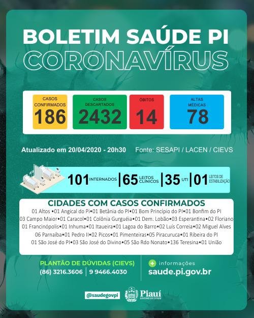 Com os novos casos, o Piauí somou 185 testes positivos para Covid-19, com 14 mortes, 2.432 casos descartados e 78 pacientes com alta médica.