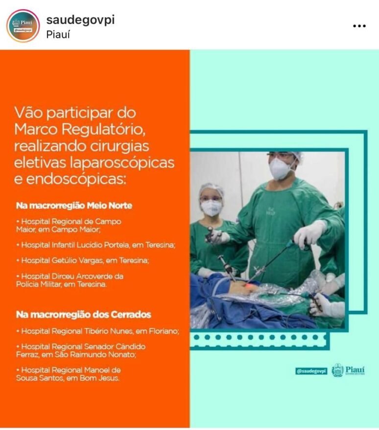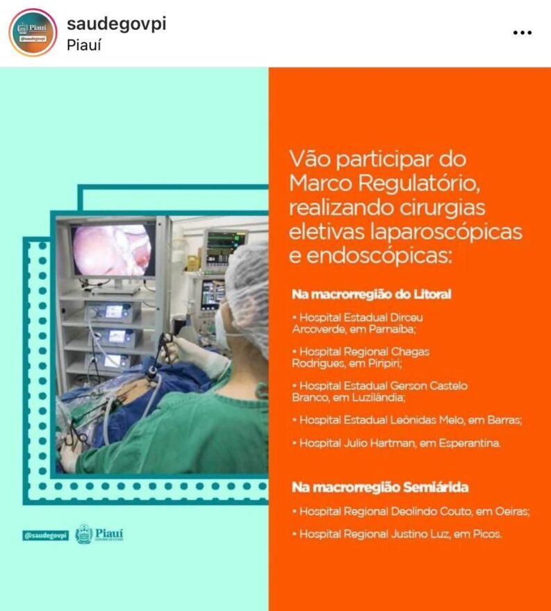 O Governo do Piauí, através da Secretaria de Estado da Saúde (Sesapi), lança nesta sexta-feira (02/07), às 8h, o Projeto Marco Regulatório da Laparoscopia no Estado do Piauí. O lançamento será feito de maneira virtual, com links ao vivo de 15 hospitais do Piauí, com 17 torres laparoscópicas. O governador Wellington Dias fará a abertura do projeto, que é pioneiro no Brasil.