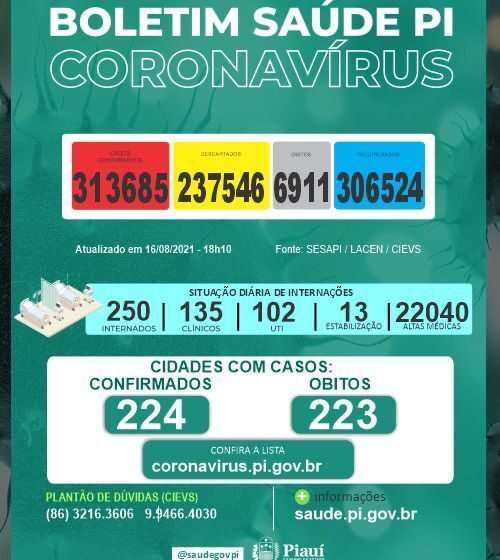 Os casos confirmados no estado somam 313.685 em todos os municípios piauienses. Já os óbitos pelo novo coronavírus chegam a 6.911 e foram registrados em 223 municípios.