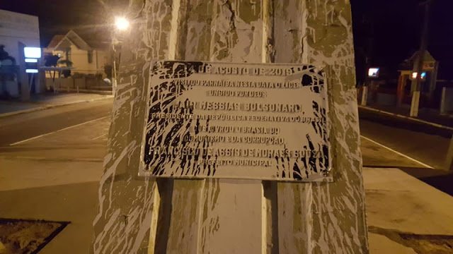 A placa Inaugurada pelo prefeito Francisco de Assis de Moraes Souza – Mão Santa – na manhã desta sexta-feira, 14 de agosto, dia do aniversário da cidade de Parnaíba, em homenagem ao presidente da república, Jair Messias Bolsonaro no Centro Cívico de Parnaíba, em menos de uma hora após sua inauguração já foi pichada e vandalizada.