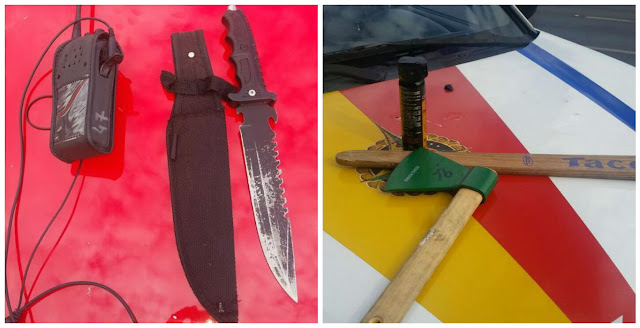 Os políciais acharam os objetos durante a vistoria nos veículos VW Gol e Renault Duster um punhal de aproximadamente 25cm, um machado de médio porte, um “taco” de madeira e um espargidor de pimenta de uso restrito.