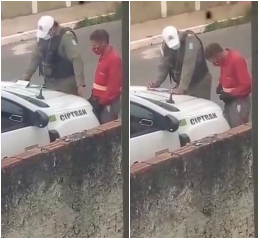 O vídeo mostra ainda, em seguida, o homem entregando algo para o PM, o que parece ser dinheiro. Depois disso, o policial coloca as mãos no capô da viatura e aparece folhear alguns papéis.