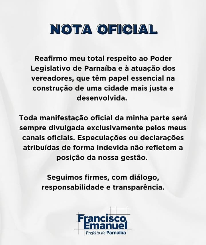 O prefeito de Parnaíba, Francisco Emanuel, divulgou ontem(29) uma nota oficial, em que reafirma seu total respeito aos vereadores de Parnaíba e nega responsabilidade sobre notas divulgados em blgos locais, dando conta de que estaria recebendo pressões de vereadores à cata de portarias. As notas divulgadas até que um só vereador chegou a exigir 144 portarias. Ainda na noite de ontem, na sessão da Câmara, alguns vereadores se manifestaram e negaram haver estado com o prefeito para pedir cargos.