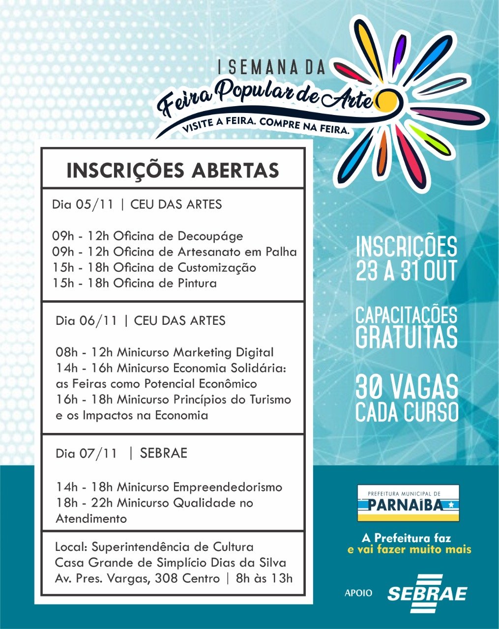 A “Semana da Feira Popular de Arte” acontecerá de 5 a 8 de novembro. O evento tem por objetivo capacitar pequenos empreendedores vinculados às feiras da cidade e demais interessados.