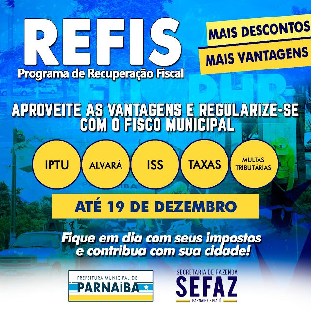 O Secretário Municipal de Fazenda de Parnaíba, Sr. Gil Borges dos Santos, informou que o programa de refinanciamento fiscal – REFIS da Prefeitura de Parnaíba, encerra-se no próximo dia 19 de dezembro.