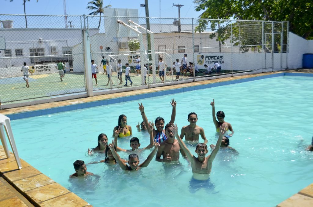 Aprendendo a nadar: – A neta de dona Francisca Silva, a aluna Eduarda Silva, chegou há seis meses ao programa, mas garante que jáo ama. “Meu tio soube do projeto e veio falar para minha avó. Com muita luta conseguimos uma vaga. Estou na fase de aprender a nadar. A cada dia eu aprendo uma coisa diferente e nova com os instrutores”, disse.