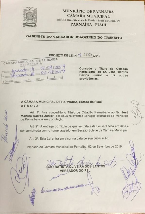 O vereador também apresentou o projeto que concede o Título de cidadão Parnaibano ao Sr. José Martins Barros Júnior. Os vereadores fizeram o uso da palavra para parabenizá-lo pela indicação do título de cidadão e enumeraram diversos trabalhos desenvolvidos.
