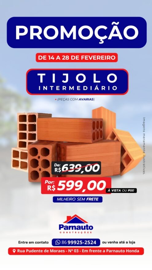Aproveite essa super oportunidade para adquirir seu tijolo e outros materiais para a sua construção na Parnauto. Faça uma visita agora mesmo e veja todas as facilidades que só a Parnauto Construções pode oferecer. Oferta válida até 28 de fevereiro de 2025 ou enquanto durar o estoque.