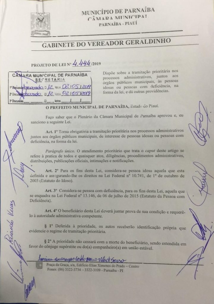 O Plenário da Câmara Municipal aprovou nesta quinta-feira (2) o Projeto de Lei Nº 4.444/2019, do vereador e atual presidente da Câmara José Geraldo Alencar Filho (PSB), que  assegura às pessoas idosas e com deficiência prioridade na tramitação dos processos  administrativos aos órgãos públicos municipais.