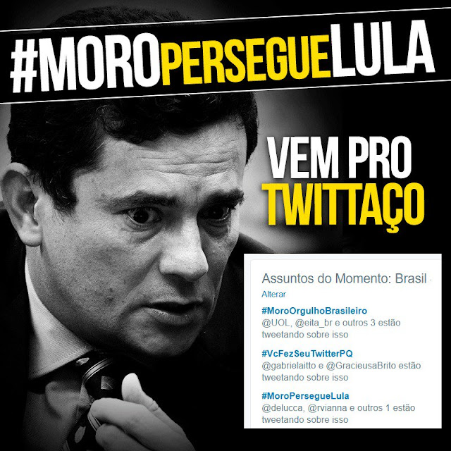 O PT também está promovendo um tuitaço com a #LulaInocente e #MoropersegueLula. Além disso, começou a convocar atos em todas as capitais para defender o ex-presidente Luiz Inácio Lula da Silva e confrontar o juiz Sérgio Moro, que nesta quarta-feira condenou o petista a nove anos e seis meses por corrupção passiva e lavagem de dinheiro. “Estamos orientando que todos possam se manifestar pelo país contra essa decisão do juiz Moro. O mote é que não se pode condenar sem provas. O Moro teve um papel de submissão aos meios de comunicação e ao capital privado nessa decisão” — disse ao Globo o ex-chefe de gabinete do ex-presidente Gilberto Carvalho.