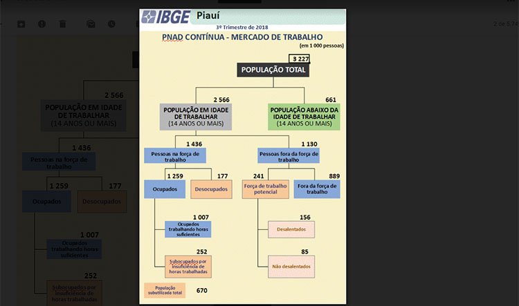 A pesquisa mostra ainda que, no 3 trimestre de 2018 ,houve um aumento da ocupação no Piauí com destaque para emprego no setor privado da economia, sem carteira assinada, que cresceu 9,1%, gerando 17 mil novos postos de trabalho. No setor da economia representado pelas pessoas que trabalham por conta própria, registrou-se uma elevação de 6,3%, com cerca de 24 mil pessoas passando a obter uma renda através da oferta de seus serviços no mercado. Entretanto, a maioria dessas pessoas, cerca de 92%, encontrou ocupação na informalidade, sem registro de seu trabalho no Cadastro Nacional da Pessoa Jurídica (CNPJ).