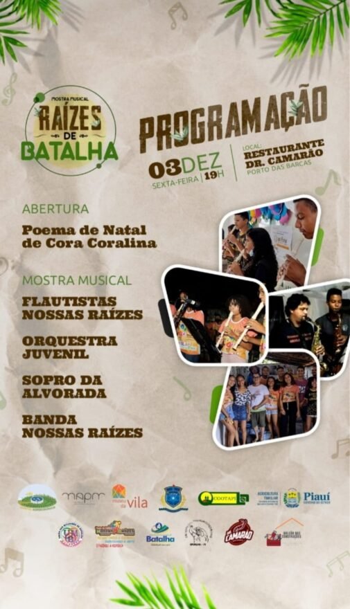 Acontece no dia 03 de dezembro de 2021 às 19h no restaurante Dr. Camarão, localizado no Porto das Barcas, a mostra musical do Ponto de Cultura “Nossas Raízes”, situado na cidade de Batalha, Piauí. Com repertórios que versam de clássicos da música nordestina à orquestra de sopro, a apresentação contará com quatro grupos musicais mantidos pelo projeto.