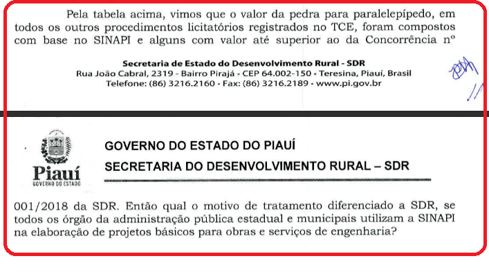 A Secretária de Desenvolvimento Rural (SDR) Patrícia Vasconcelos Lima chegou a informar ao Tribunal de Contas do Estado do Piauí (TCE) que pastas do governo chegam a realizar licitações para pavimentação em paralelepípedo com preço a maior – o que para a Corte de Contas é rotulado de “sobrepreço”.