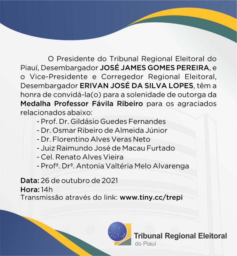 O Secretário de Estado da Saúde, Florentino Neto, foi um dos agraciados, na tarde desta terça-feira, com a Medalha de Mérito Eleitoral, uma distinção do Tribunal Regional Eleitoral, presidida pelo Desembargador José James Gomes Pereira. Com ele, outras autoridades também foram agraciadas, conforme convite abaixo: