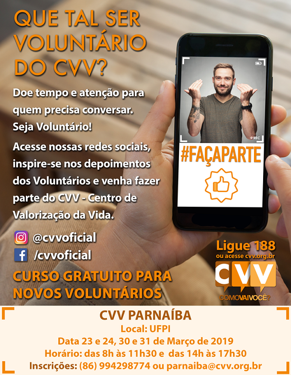 Em favor da vida e pela prevenção do suicídio, o Centro de Valorização da Vida (CVV) de Parnaíba convida pessoas interessadas, e maiores de 18 anos, a participar do Curso de Seleção de Voluntários (CSV) a ser realizado nos dias 23 e 24, 30 e 31 de Março, das 08h às 11h30 e das 14h às 17h30h, na Universidade Federal do Piauí, campus Parnaíba, sala 729. As inscrições e participação no curso são gratuitos.