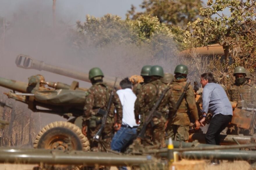 Ao lado do novo ministro da Casa Civil, Ciro Nogueira,  Bolsonaro deu tiro em um obuseiro de artilharia de 150 mm. As balas atingiram um campo largo e vazio.