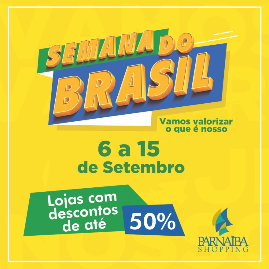 Com a finalidade de aquecer a economia com diversas promoções, a “Semana do Brasil” vem para estimular o consumo no período de 06 a 15 de setembro, onde as lojas do Parnaíba Shopping estarão oferecendo descontos de até 50% em produtos e serviços. A ação tem o apoio da Associação Brasileira de Shopping Centers (Abrasce), é idealizada pela Secretaria de Comunicação Social da Presidência da República (Secom) e tem como inspiração o varejo norte-americano, que costuma realizar promoções em feriados nacionais históricos.