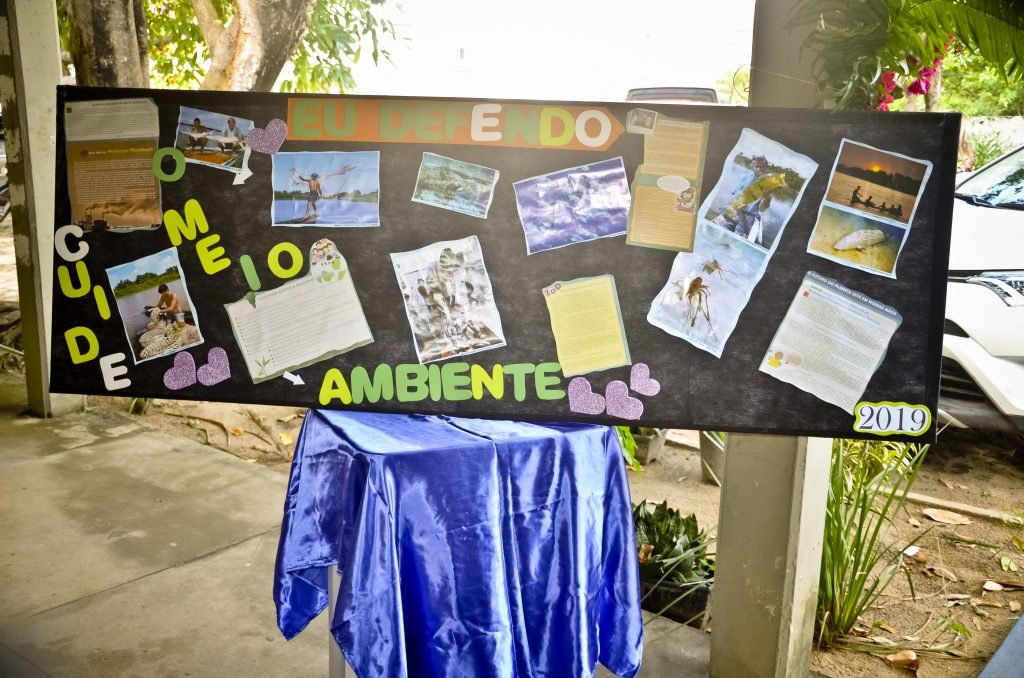 Em frente ao auditório, onde está sendo realizada a semana do meio ambiente foram expostos trabalhos feitos pelos alunos como parte das atividades previstas no planejamento pedagógico.