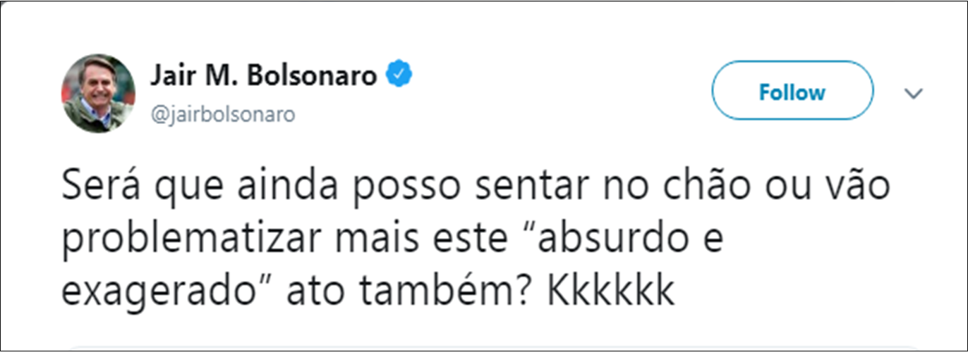 Bolsonaro compartilhou uma foto publicada por um de seus filhos, o vereador pelo Rio de Janeiro Carlos Bolsonaro (PSC), onde aparece sentado no chão.