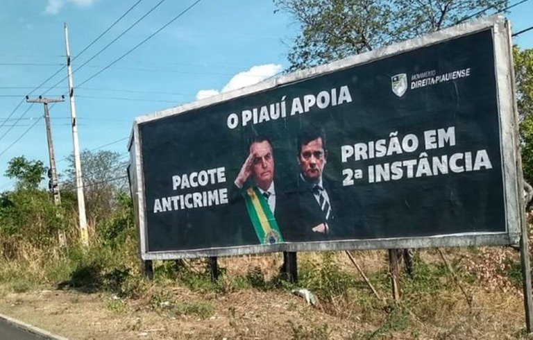 O ministro da Justiça e da Segurança Pública Sérgio Moro falou sobre o apoio dos piauienses à decisão de manter na prisão réus com condenação em segunda instância e ao Pacote Anticrime. Nas redes sociais, ele compartilhou a foto de um outdoor colocado por membros do grupo “Direita Piauiense”. O ex-juiz, que ficou famoso por julgar processos do ex-presidente Lula, na Operação Lava Jato, chamou de “fundamental” a defesa da pauta.