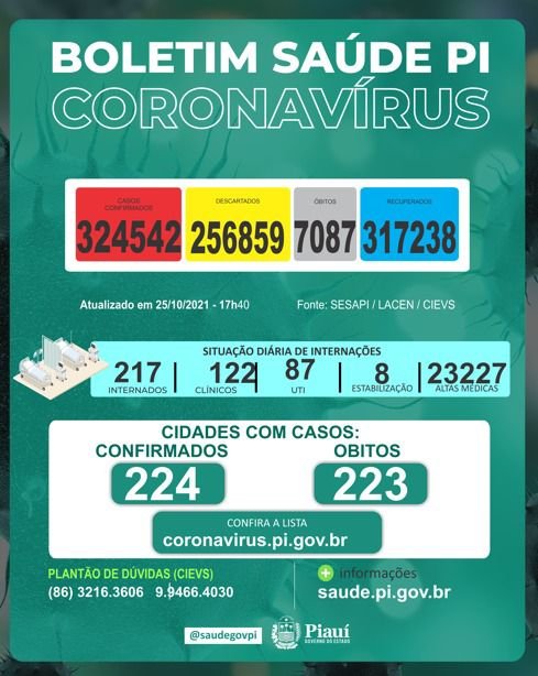 Os casos confirmados no estado somam 324.542 em todos os municípios piauienses. Já os óbitos pelo novo coronavírus chegam a 7.087 e foram registrados em 223 municípios.