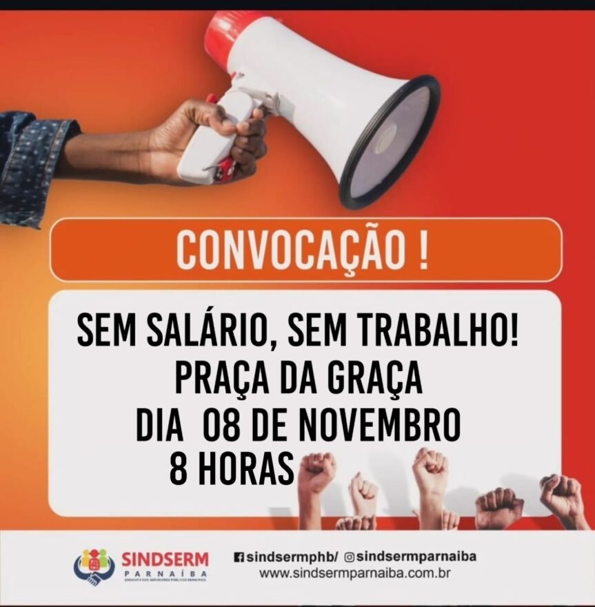 O Sindserm Parnaíba, convoca Todas e Todos Servidores da Saúde vinculados à Prefeitura Municipal para um ato de paralisação, caso o pagamento do mês de outubro não seja efetuado no dia 07/11 quinto dia útil do mês subsequente de acordo com o Estatuto dos Servidores Municipais.