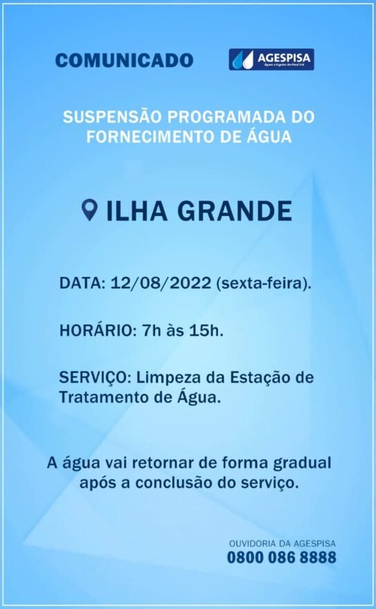 Suspensão fornecimento de água na Ilha Grande Posted by Bernardo Silva on 11 de agosto de 2022 in Em Destaque Em Destaque