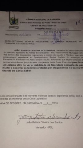 Joãozinho pediu também, em outro requerimento que a Secretaria competente da Prefeitura busque um meio de socorrer várias famílias que foram afetadas por alagamentos, no bairro Ilha Grande de Santa Isabel, estando passando por necessidades. “Estão vivendo em situação muito triste”, pontuou o vereador.