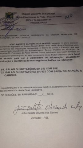 A Câmara Municipal de Parnaíba aprovou na noite de terça-feira(8) requerimento de autoria do vereador Joãozinho do Trânsito (PSL) onde ele solicita da prefeitura estudos para ver a viabilidade de informações sobre sinalização, iluminação e identificação das rotatórias da BR 343/ ZPE e rotatória da BR 402 com Baixa do Aragão/ Carpina.