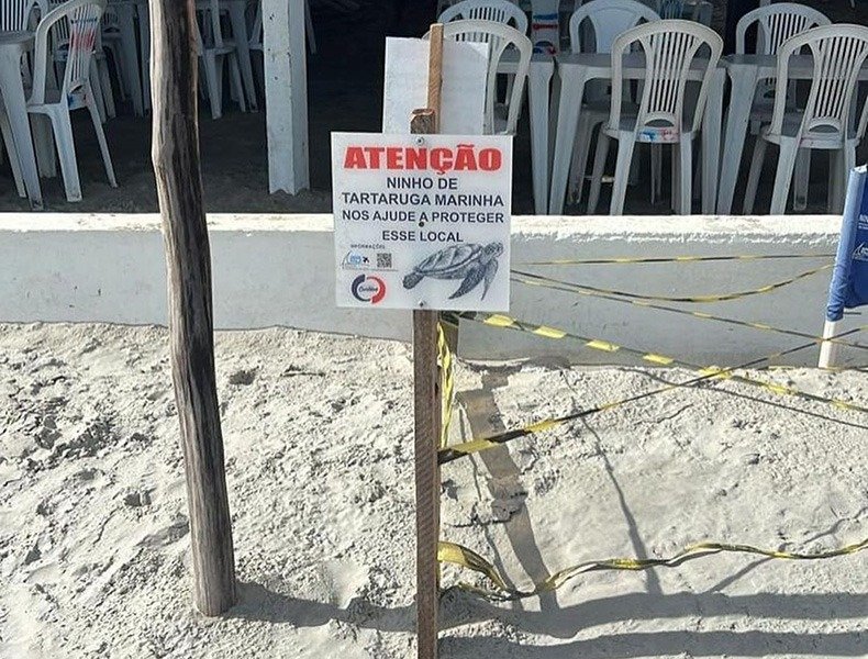 Uma tartaruga marinha resolveu desovar próximo à uma barraca na Praia de Atalaia, em Luís Correia, no litoral do Piauí. O local é uma das áreas litorâneas monitoradas pelo Instituto Tartarugas do Delta, e demais órgãos de proteção, que inclusive instalou uma placa alertando sobre o ninho.