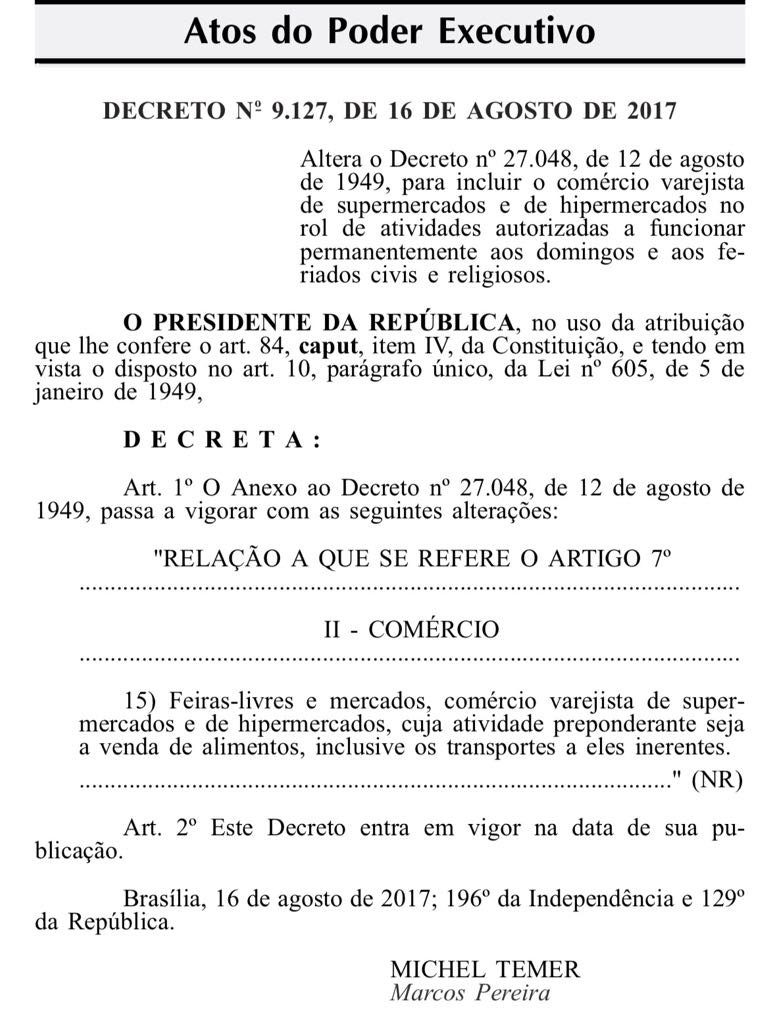 O presidente da República, Michel Temer  (PMDB), alterou, na última quarta-feira (16), o decreto Nº 27.048 de 12 de agosto de 1949, e agora os supermercados e hipermercados são considerados estabelecimentos de atividades essenciais e, por isso, passam a funcionar normalmente aos domingos e feriados religiosos e civis.