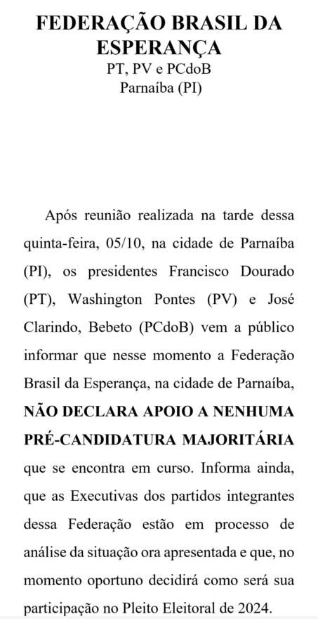 “A posição de não alinhamento a nenhum pré-candidato a prefeito de Parnaíba é resultado de decisão política tomada em reunião com os presidentes das três siglas, Francisco Dourado (PT), Washington Pontes (PV) e José Clarindo (PCdoB). “A federação Brasil da Esperança em Parnaíba não declara apoio a nehuma pré-candidatura majoritária”, diz trecho de nota. Os três partidos afirmam ainda que permanecem em processo de análise do cenário político em Parnaíba. Na semana passada o deputado federal Florentino Neto (PT) desistiu da pré-candidatura no município”.(Elivaldo Barbosa)