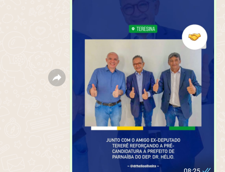 O ex-deputado estadual Tererê disse, a respeito da foto acima, que é o Dr. Hélio quem poderá vir a apoiar sua pré-candidatura a prefeito de Parnaíba, caso ele esteja na frente nas pesquisas de intenção de votos que o governo do Estado vai realizar no final do ano. Até agora, Tererê não fechou apoio com ninguém e continua candidatíssimo. Ele esteve com o governador Rafael Fonteles nesta segunda-feira, tratando do assunto.