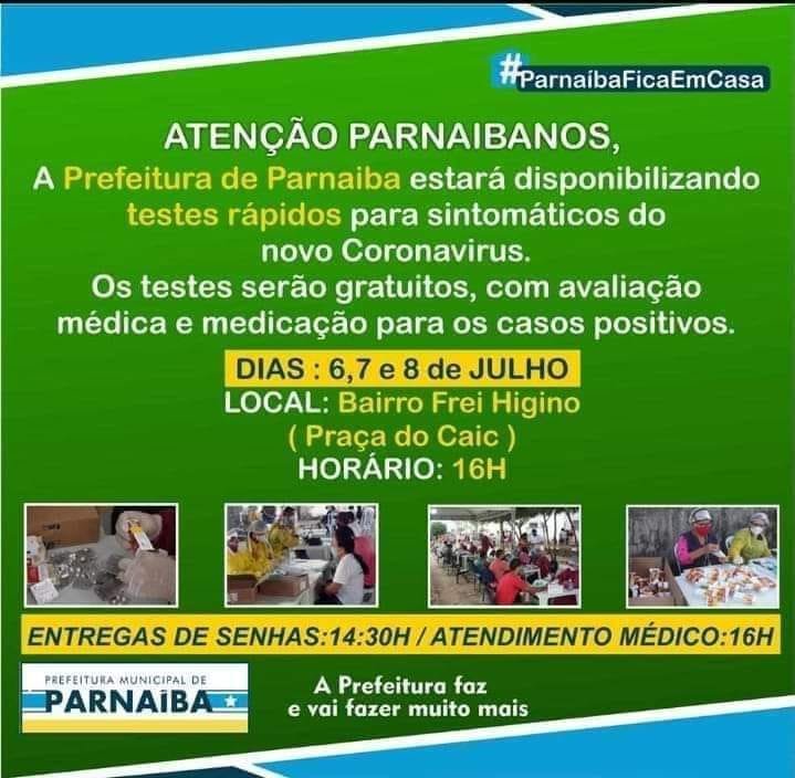 Prefeitura de Parnaíba realizará testes rápidos Covid-19 no Bairro Frei Higino, na Praça do Caic, às 16h, nos dias 6, 7 e 8 julho.