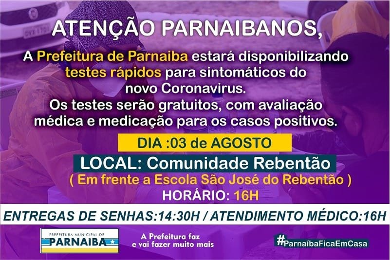 Testes rápidos: Prefeitura faz atendimentos hoje no Rebentão Posted by Bernardo Silva on 3 de agosto de 2020 in Cidade Cidade