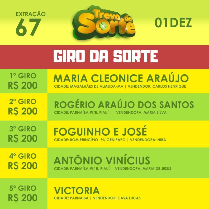 No último domingo (01), em Parnaíba, mais uma extração semanal do ‘Trevo Da sorte’ que vem realizando o sonho de muita gente. O sorteio dessa semana teve 2 PRÊMIOS de R$2.000, 2 PRÊMIOS R$3.000 e um super prêmio de R$25.000 com uma moto Titan que saiu para 01 ganhador , além do giro da sorte que teve 5 ganhadores levou R$200,00 cada um.