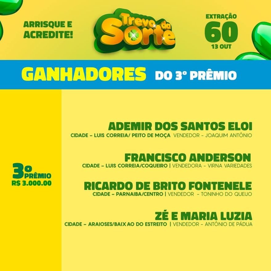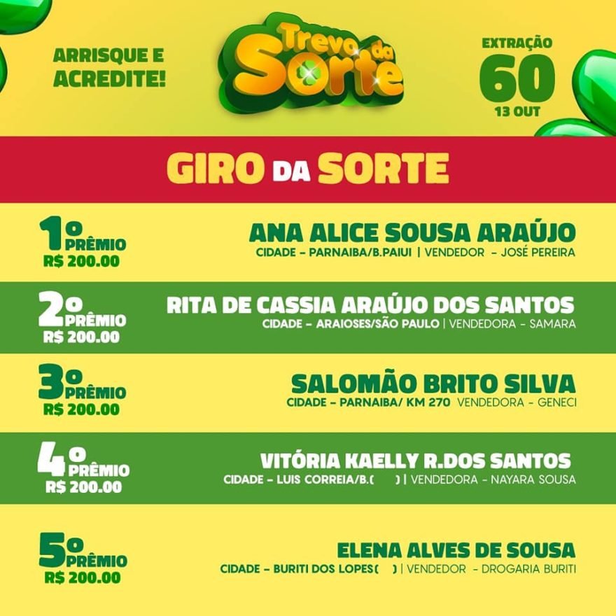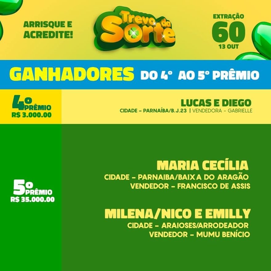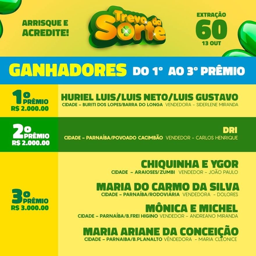 Foi realizado no último domingo (13), em Parnaíba, mais uma extração semanal do ‘Trevo Da sorte’ que vem realizando o sonho de muita gente. O sorteio dessa semana teve 2 PRÊMIOS de R$2.000, 8 PRÊMIOS R$3.000 e um super prêmio de R$35.000 que saiu para 02 ganhadores, além do giro da sorte que teve 5 ganhadores levou R$200,00 cada um.