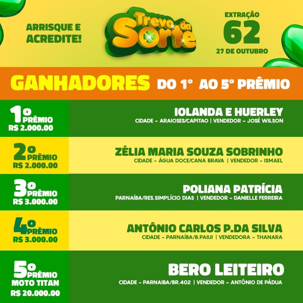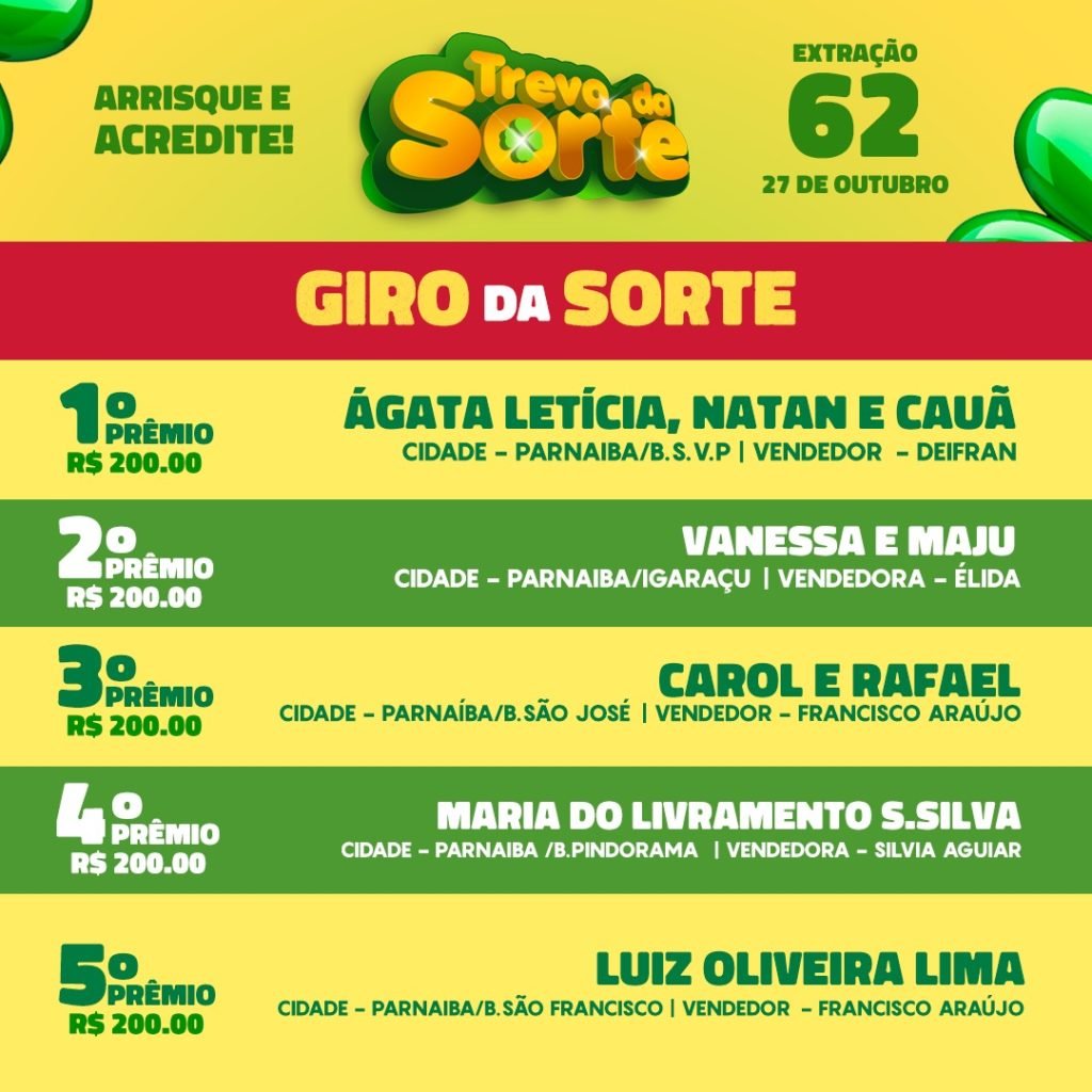 No último domingo (27), em Parnaíba, mais uma extração semanal do ‘Trevo Da sorte’ que vem realizando o sonho de muita gente. O sorteio dessa semana teve 2 PRÊMIOS de R$2.000, 2 PRÊMIOS R$3.000 e um super prêmio de R$20.000 que saiu para 01 ganhador, além do giro da sorte que teve 5 ganhadores levou R$200,00 cada um.