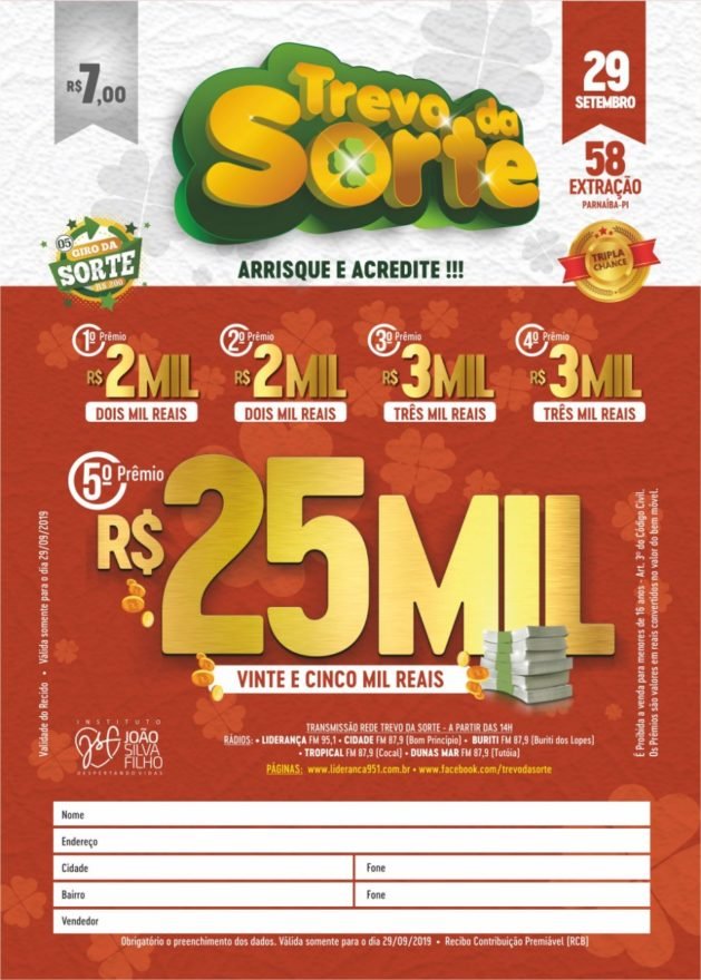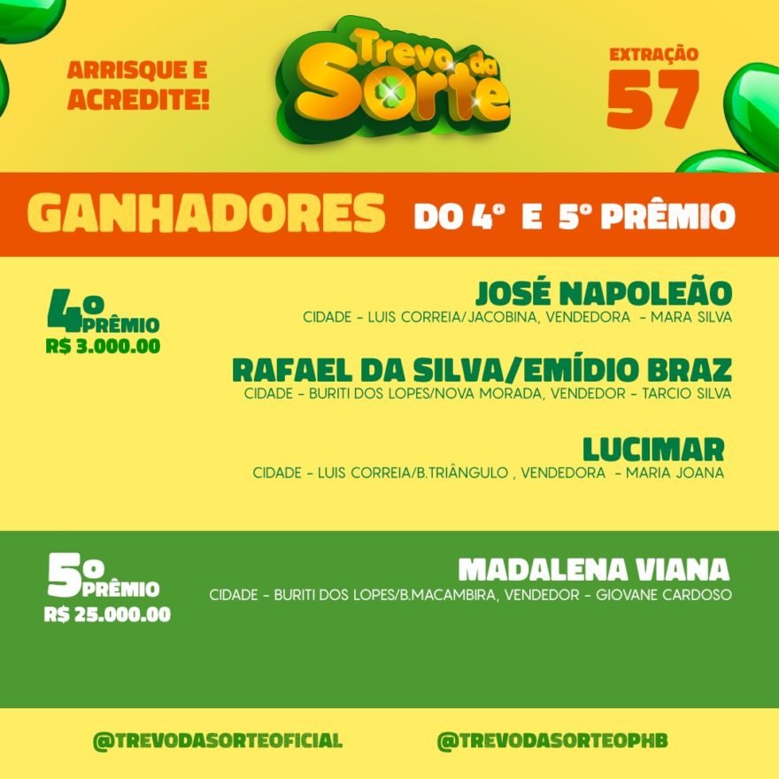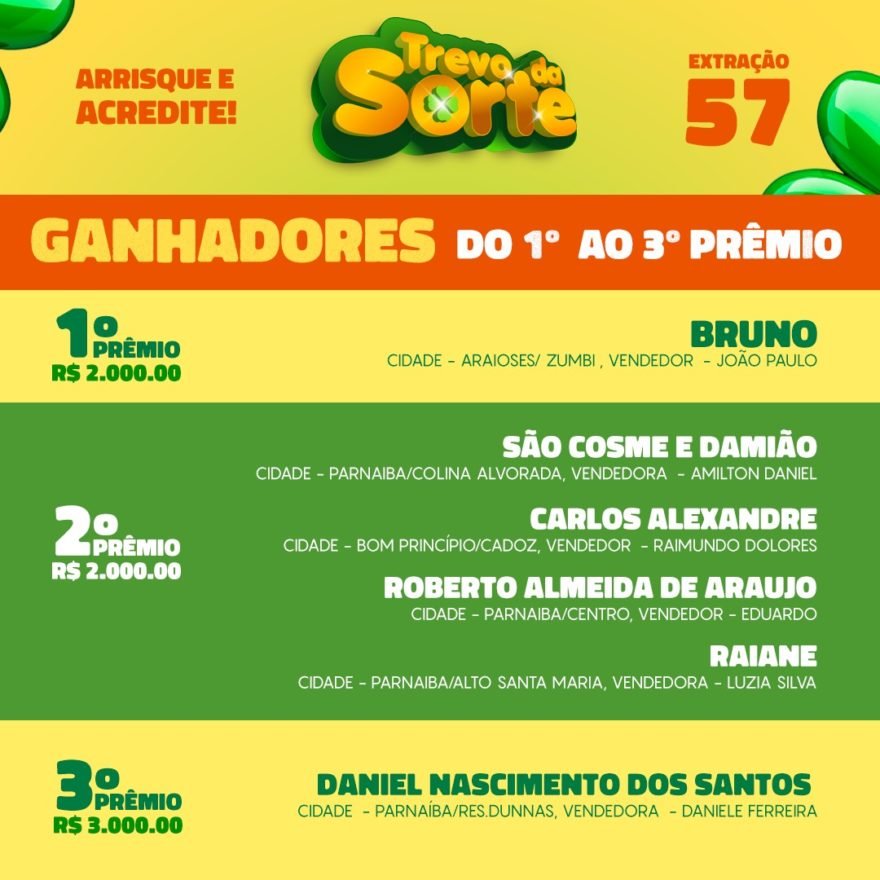 Foi realizado no último  domingo (22), em Parnaíba, mais uma extração semanal do ‘Trevo Da sorte’ que vem realizando o sonho de muita gente, o sorteio  dessa semana teve  2 PRÊMIOS de R$2.000, 2 PRÊMIOS R$3.000  e um super prémio de R$25.000  que saiu para 01 ganhador, além do giro da sorte que teve 5 ganhadores levou R$200,00 cada um.
