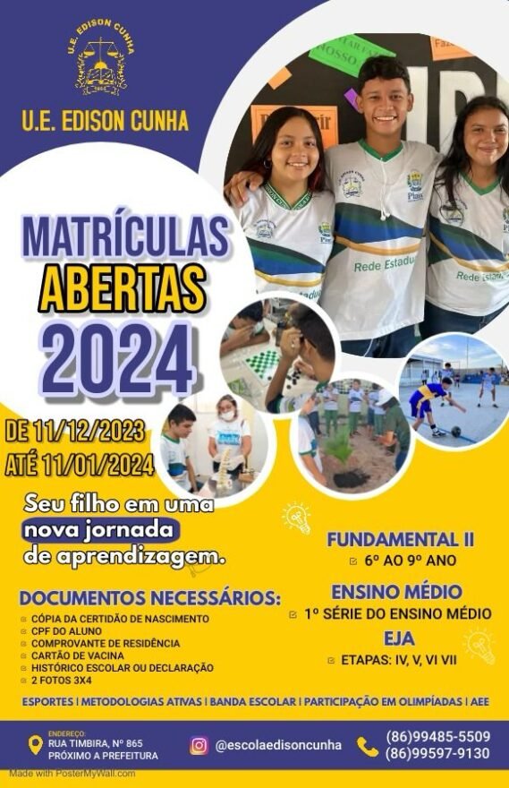 Teve início nesta segunda-feira (11) e segue até 11 de janeiro, o processo de inscrição das matrículas 2024 da Unidade Escolar Edson Cunha, situada na Rua Timbira, no Bairro Pindorama, próximo a Prefeitura.