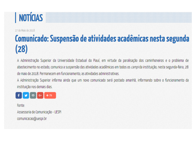 A Administração Superior da Universidade Estadual do Piauí, em virtude da paralisação dos caminhoneiros e o problema de abastecimento no estado, comunica a suspensão das atividades acadêmicas em todos os campi da instituição, nesta segunda-feira, 28 de maio de 2018.