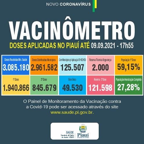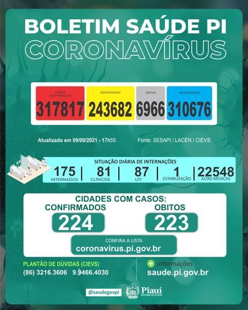Os casos confirmados no estado somam 317.817 em todos os municípios piauienses. Já os óbitos pelo novo coronavírus chegam a 6.966 e foram registrados em 223 municípios.