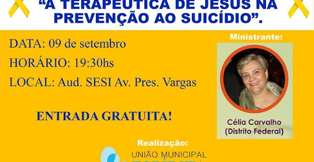 A UME – União Municipal Espírita de Parnaíba, convida aos espíritas e a sociedade parnaibana, a participarem de uma palestra a ser realizada dia 9 de setembro, às 19:30h, no auditório do Sesi, da Avenida Presidente Vargas, como parte da Campanha Setembro Amarelo realizada em todo o Brasil. A palestra que terá como tema – A terapêutica de Jesus na prevenção ao suicídio, será ministrada por Célia Carvalho, do Distrito Federal.