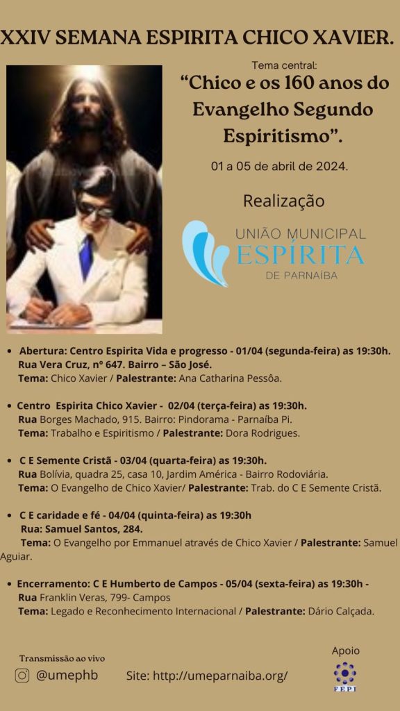 A União Municipal Espirita (UME) de Parnaíba vai realizar a XXIV Semana Espírita Chico Xavier, de segunda-feira (01/04) à sexta-feira (05/04). Um evento significativo para o movimento espírita da cidade de Parnaíba e região. A semana será dedicada a reflexões, palestras e atividades relacionadas à espiritualidade, caridade e amor ao próximo, todas essas características vivenciadas e exemplificadas pelo homem Francisco de Pádua Candido.