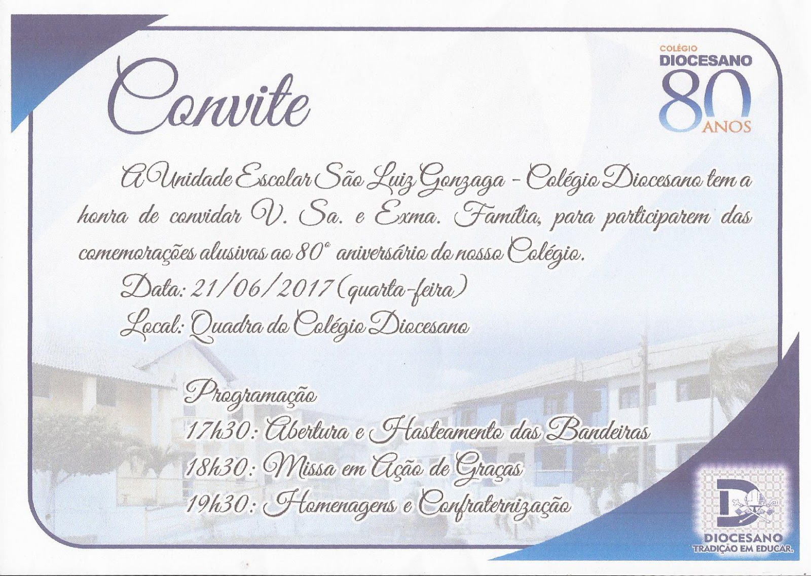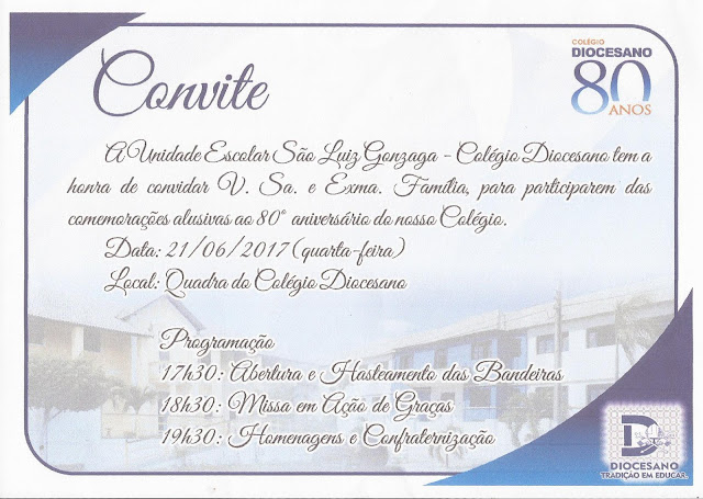 Unidade Escolar São Luiz Gonzaga – Colégio Diocesano faz aniversário nesta quarta feira (21) Posted by Bernardo Silva on 21 de junho de 2017 in Diversos Diversos
