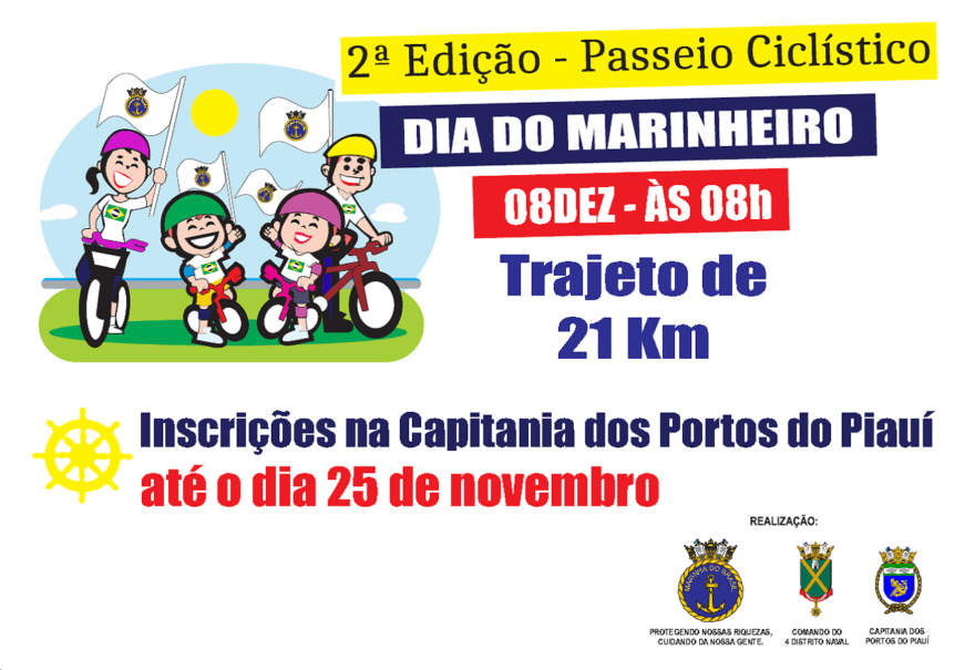 O Capitão de Fragata Dante, Capitão dos Portos do Piauí falou que as inscrições estão abertas para o passeio ciclístico. “Para efetuarem as inscrições os interessados devem procurar a Capitania dos Portos com 1 kg de alimento não perecível, exceto sal, e mais 1litro/kg de produto de limpeza. Podem participar pessoas de ambos os sexos, acima de 12 anos. Os menores de idade deverão ter suas inscrições feitas pelos pais e/ou responsáveis, que obrigatoriamente deverão também estar inscritos e acompanhar o menor durante todo o trajeto”, disse o Capitão.