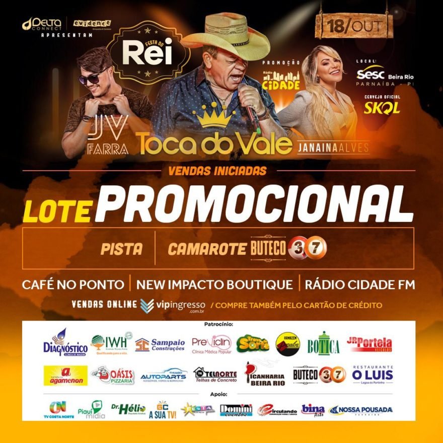 Iniciaram nesta segunda-feira (16/09) as vendas de ingressos antecipados para a Festa do Rei com Toca do Vale, Janaína Alves e JV Farra. Os postos autorizados são: Café no Ponto (centro), New Impacto Boutique e na Rádio Cidade FM.