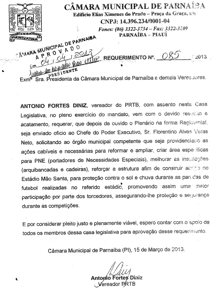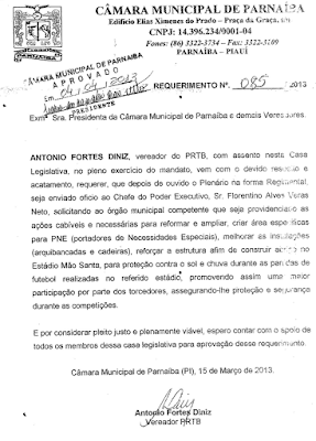 Também aproveito o ensejo para agradecer ao Prefeito Florentino e sua equipe (Secretaria de Esportes e Lazer) por serem protagonistas dessa vitória, e em especial por atender nosso requerimento 085/2013 (aprovado em 04.04.13), solicitando a recuperação do estádio.